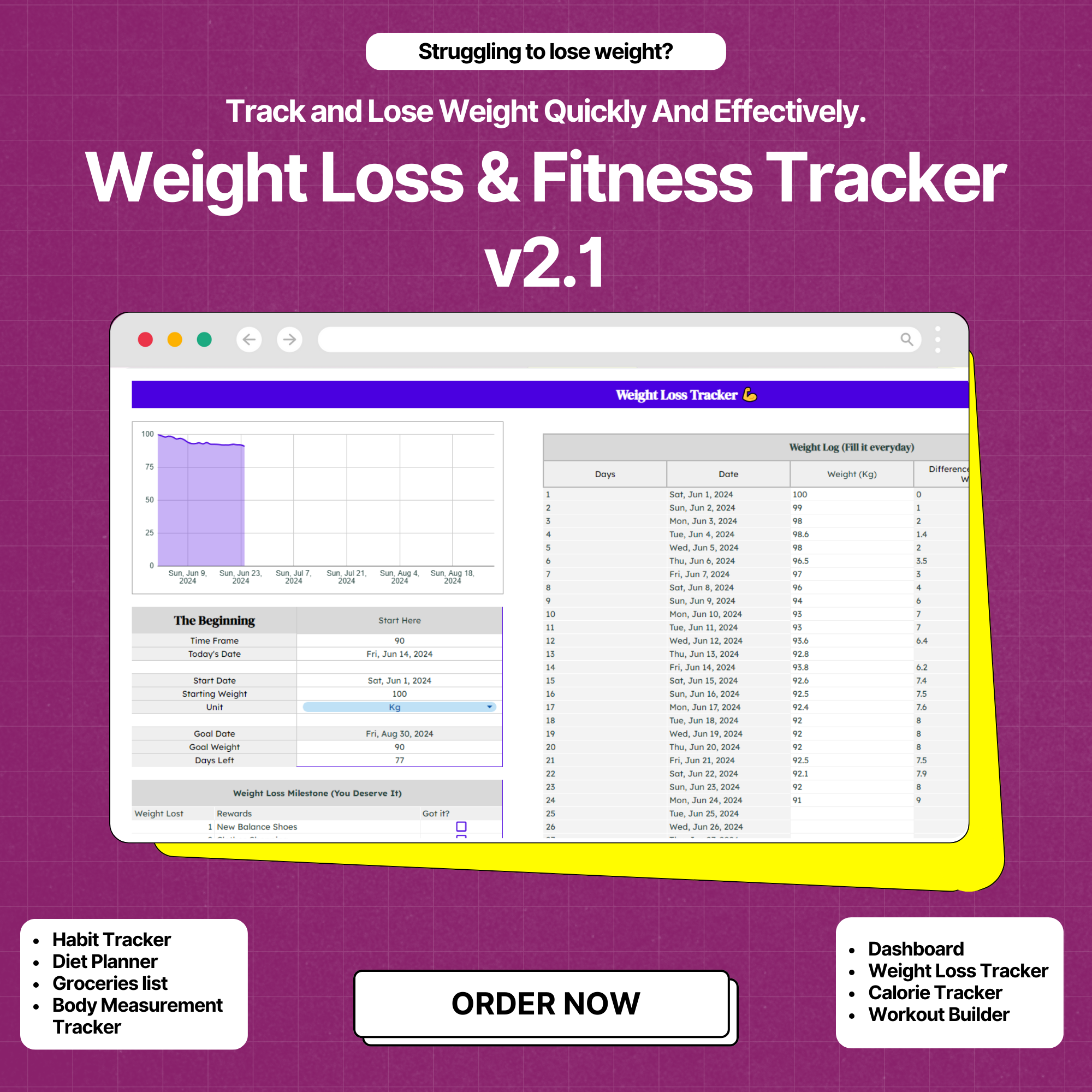 💸 Ready to Transform Your Fitness Journey? 💸 Our Weight Loss Planner Spreadsheet is your ultimate tool for shedding pounds and staying organized. With features like a customizable dashboard, weight loss tracker, calorie tracker, workout builder, and more, achieving your fitness goals has never been easier. Key Features: Dashboard: Get a concise summary of your fitness journey, including weight loss progress, daily calorie intake, and body measurements. Weight Loss Tracker: Visualize your progress with interactive graphs, set goals, log daily weights, and celebrate milestones. Calorie Tracker: Calculate personalized BMR and daily calorie requirements, log daily calorie intake, and balance consumed vs. burned calories. Workout Builder: Track workout details, schedule routines, and monitor progress. Diet Planner: Organize weekly meals, track daily calories and macros, and generate grocery lists. Habit Planner: Cultivate and track daily habits with a fun, visual reward system. Grocery Tracker: Efficiently organize your shopping list by category. Why You'll Love It: Fully Customizable: Tailor the tracker to fit your unique fitness goals, whether it’s weight loss, muscle gain, or overall health improvement. Easy-to-Use: Works seamlessly with Google Sheets and Microsoft Excel, designed for simplicity and accessibility. Visual Progress: Stay motivated with detailed graphs and statistics that highlight your achievements. Perfect For: Individuals looking to lose weight, maintain a balanced diet, and stay consistent with their fitness routine. How It Works: Download & Setup: Instantly download and input your initial data. Plan Your Routine: Organize meals, create a shopping list, and schedule workouts. Track Your Progress: Record daily weight, workouts, calorie intake, and habit completion. Visualize Your Transformation: Monitor changes with progress pictures and measurement tracking. Customer Testimonials: "This spreadsheet is so easy to use, and the visuals really help me stay motivated." – Sonakshi G. "It helps me plan my meals, stay on top of my calorie intake, and track my workouts effortlessly." – Anunay K. "I love how organized and user-friendly this spreadsheet is. It's been a game-changer for me!" – Aryan R. Order Now for Only ₹299 and Start Your Journey to a Healthier You!